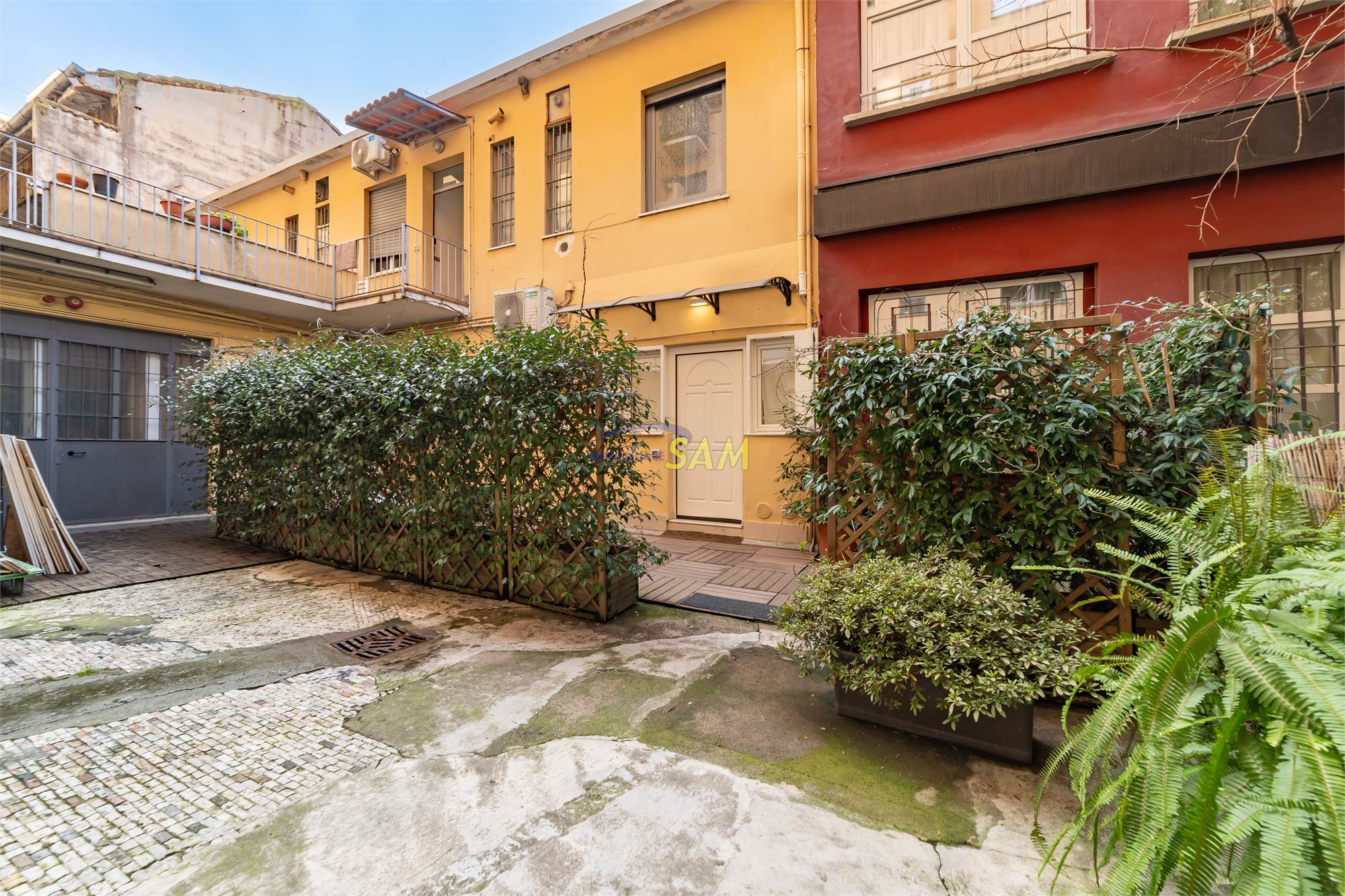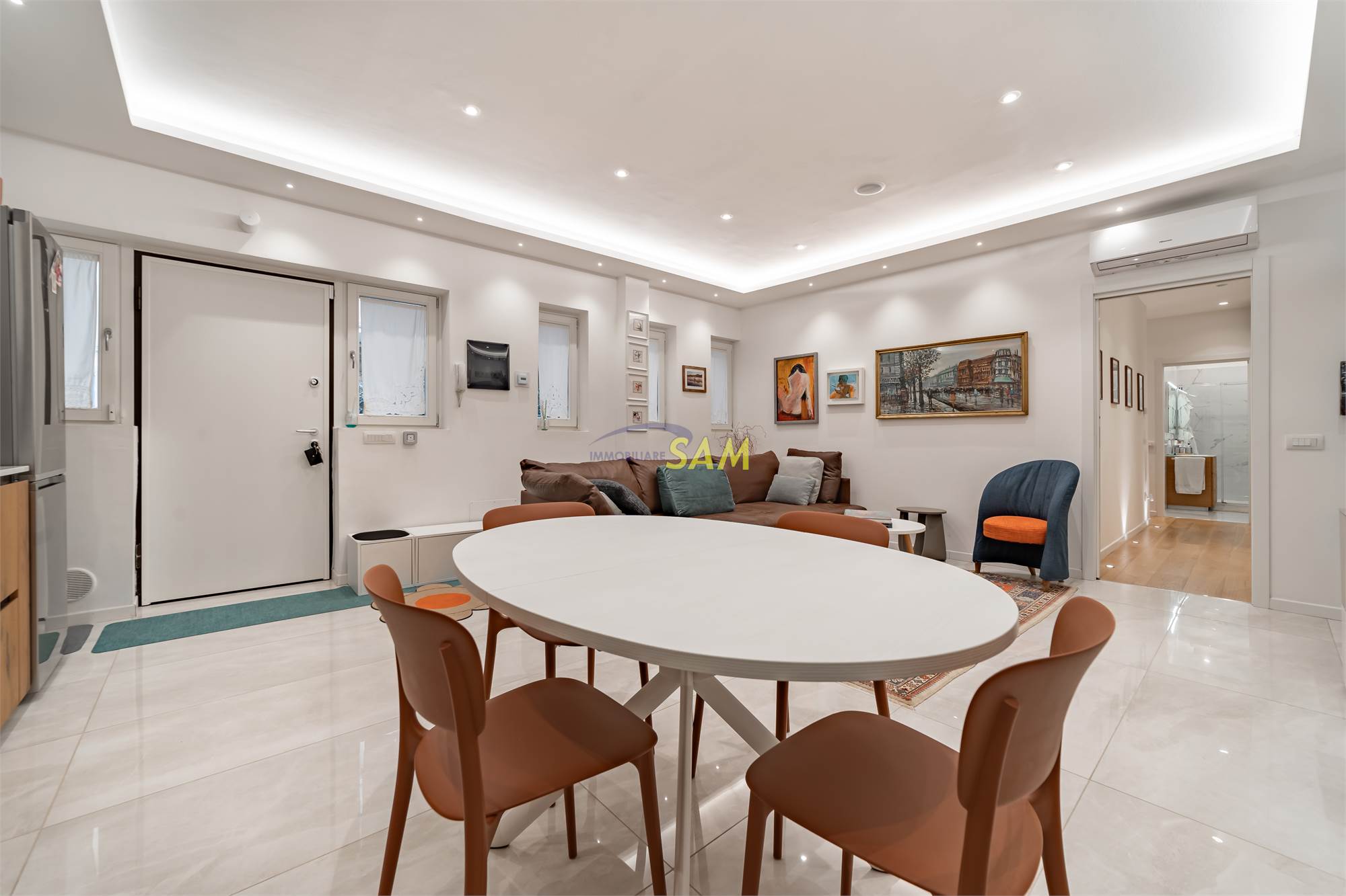 L’appartamento, pur trovandosi al piano leggermente seminterrato, non affaccia in alcun modo sulla strada: si raggiunge tramite una rampa interna che conduce al cortile condominiale e, per percezione e fruibilità, si presenta come un vero piano terra, con finestre di dimensioni standard e ambienti luminosi e ben arieggiati.