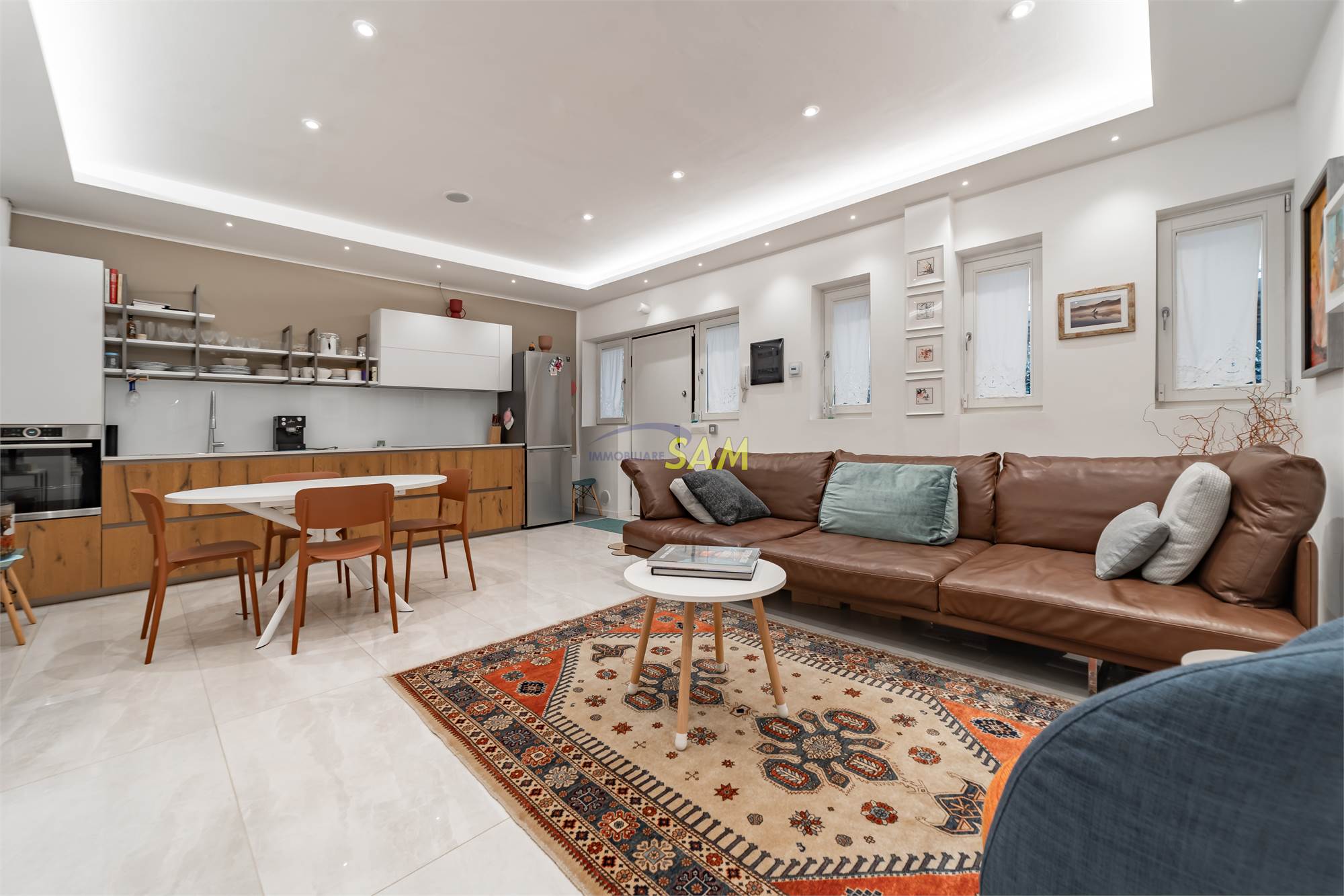 La casa è stata completamente ristrutturata con finiture di pregio e un moderno impianto di illuminazione a LED che valorizza ogni ambiente. L’ampia zona giorno in open space con cucina a vista crea un luogo accogliente e raffinato, mentre un corridoio conduce alla zona notte composta da due camere da letto matrimoniali, una delle quali dotata di bagno privato, oltre a un secondo bagno indipendente. Gli spazi sono distribuiti con cura e garantiscono comfort e funzionalità.