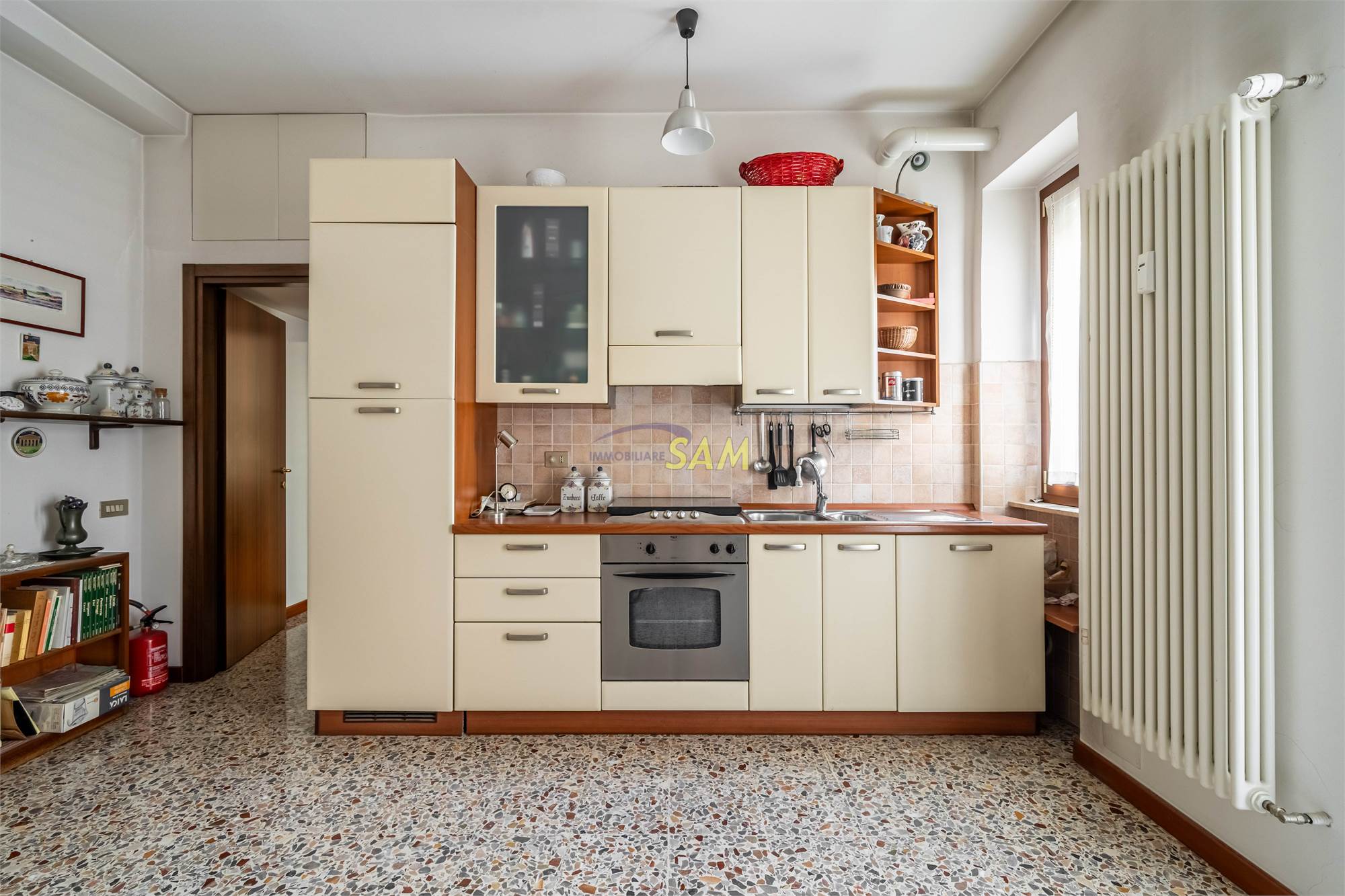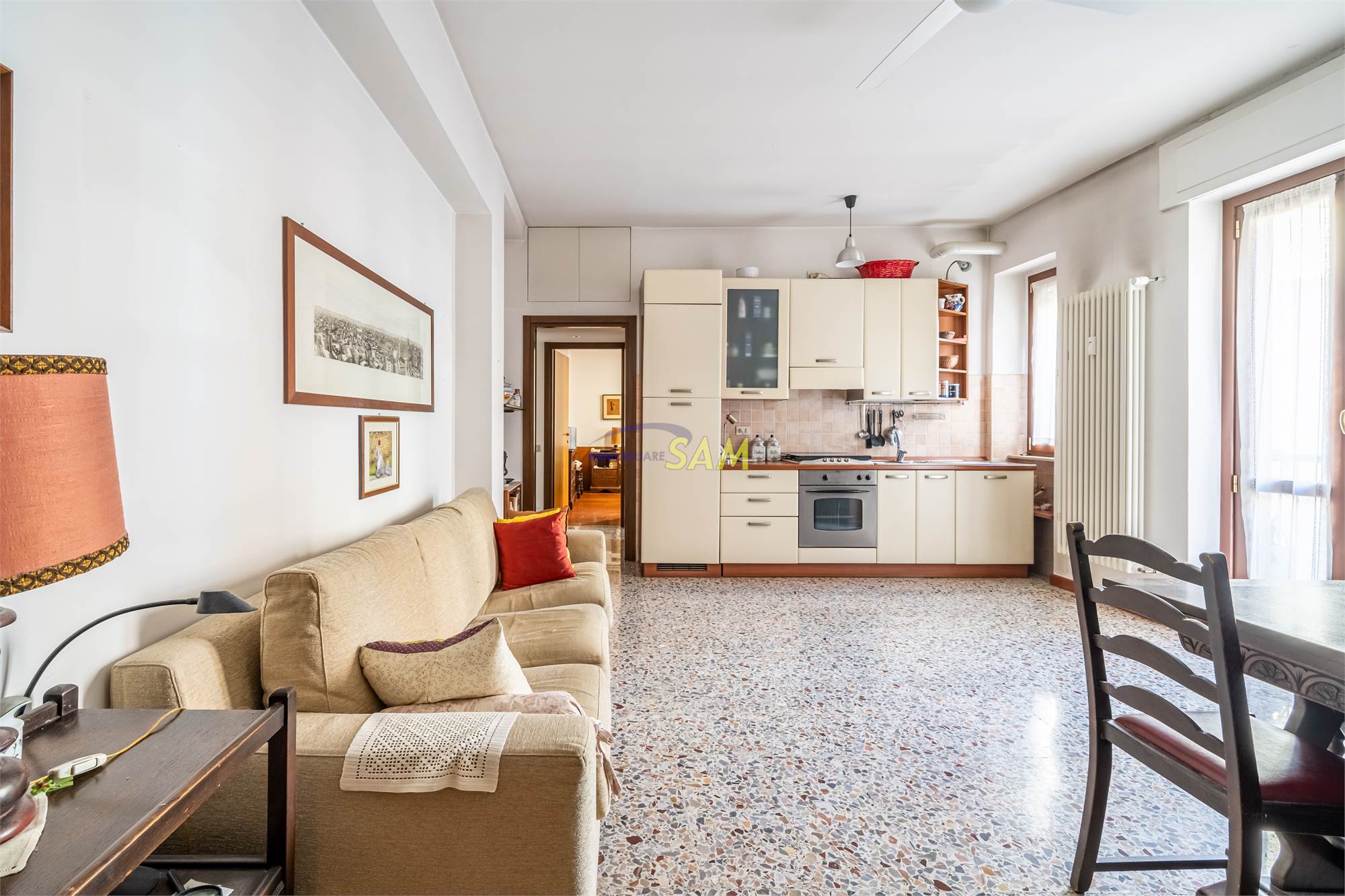 The kitchen, adjacent to the living room, is open-plan, creating a convivial and modern environment. The heating is centralized and supplied by a methane boiler, while the heating system consists of radiators.